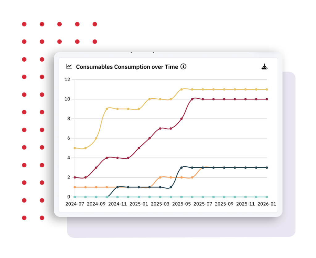 The Consumable Consumption over Time chart shows manually recorded consumable usage per robot model, including items such as main brushes, side brushes, and dustbags. It aggregates replacements over the selected period to visualize wear across the fleet. This helps identify maintenance intensity, detect abnormal usage, and understand cost and wear patterns between different robot models.